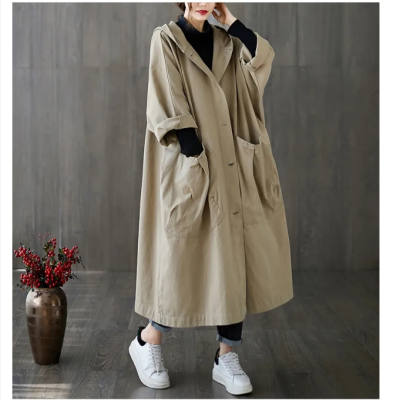 Loose plus Size Overknee Long Large Pocket Windbreaker Coat for Women Hooded Casual All-Matching