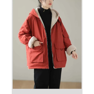 Women's plus Size Clothing Loose Artistic Vintage Long Sleeve Hooded Warm Jacket New