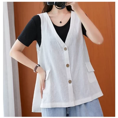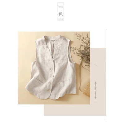 New Artistic Retro Loose V-neck Cotton and Linen Jacquard Vest Casual All-matching Thin Small Coat for Women