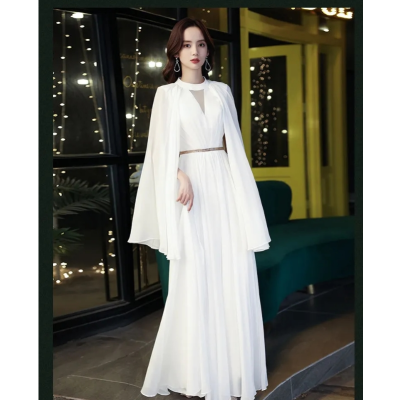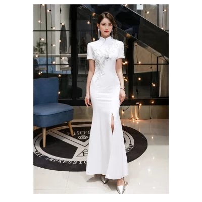Women's Fishtail Evening DressNew Style High-End Temperament White Split Cheongsam for Host Annual Meeting