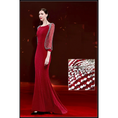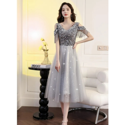 Dinner dress formal prom gown long dress for dinner Gray Evening Dress New Mid-Length Short Sleeve Sequined Banque