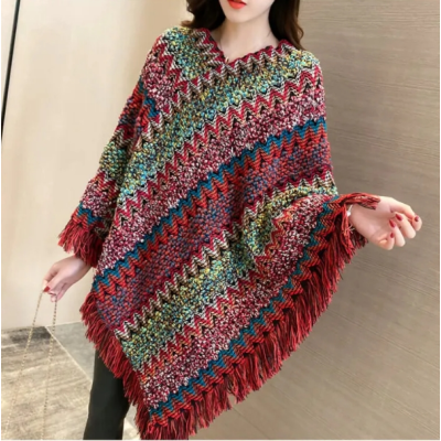 New Pullover Sweater Coat Women's Loose Cape Tassel Shawl Seven-Color Rainbow Striped Knitted Top