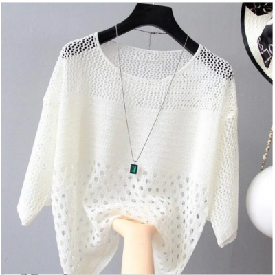 Chic Summer New 2021 Women's Clothing Korean Style Loose Low round Neck Thin Hollow Knitted Sun Protective Blouse Top Fashion